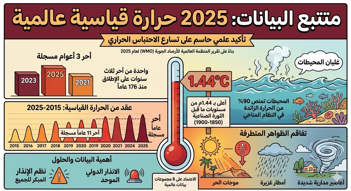 - تصنيف تاريخي: يصنف عام 2025 كواحد من أحر ثلاثة أعوام على الإطلاق منذ بدء السجلات المناخية قبل 176 عاماً.
